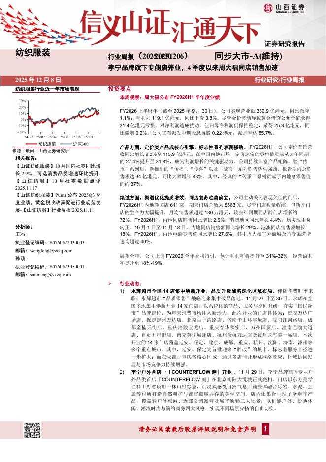 山西证券:纺织服装行业周报:李宁品牌旗下专业户外门店开业,4季度以来周大福同店销售加速.pdf