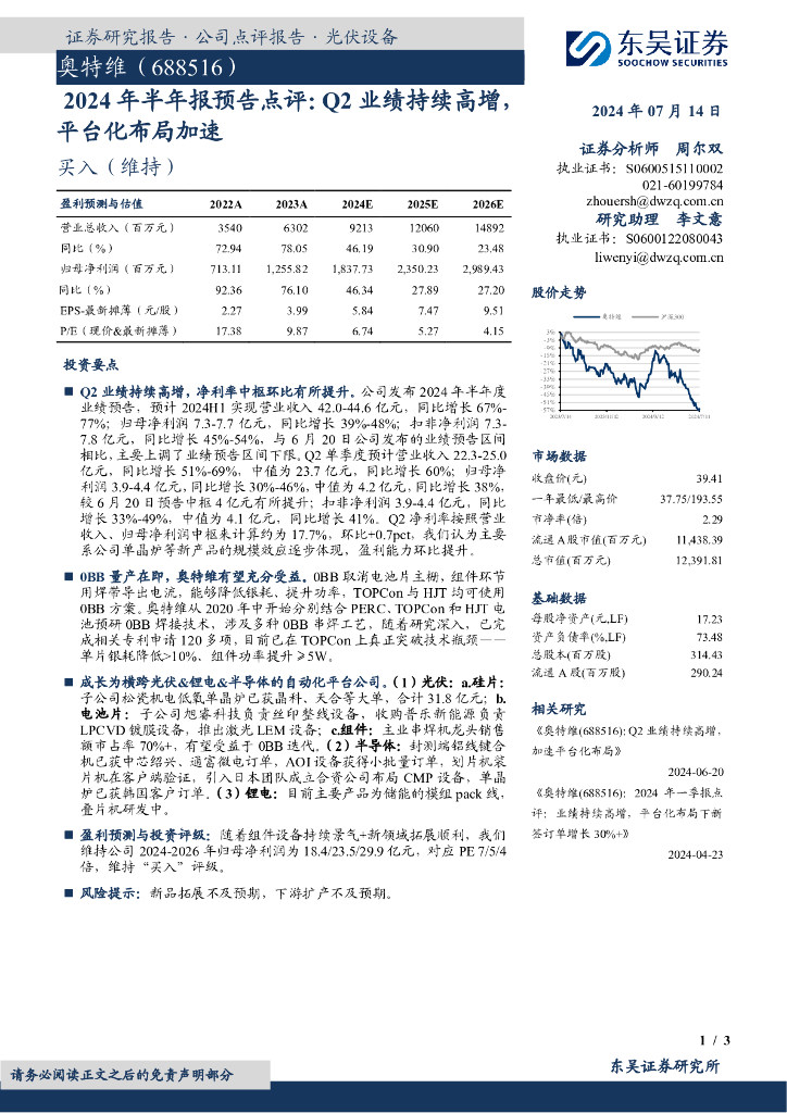 东吴证券:奥特维(688516)-2024年半年报预告点评:Q2业绩持续高增,平台化布局加速.pdf