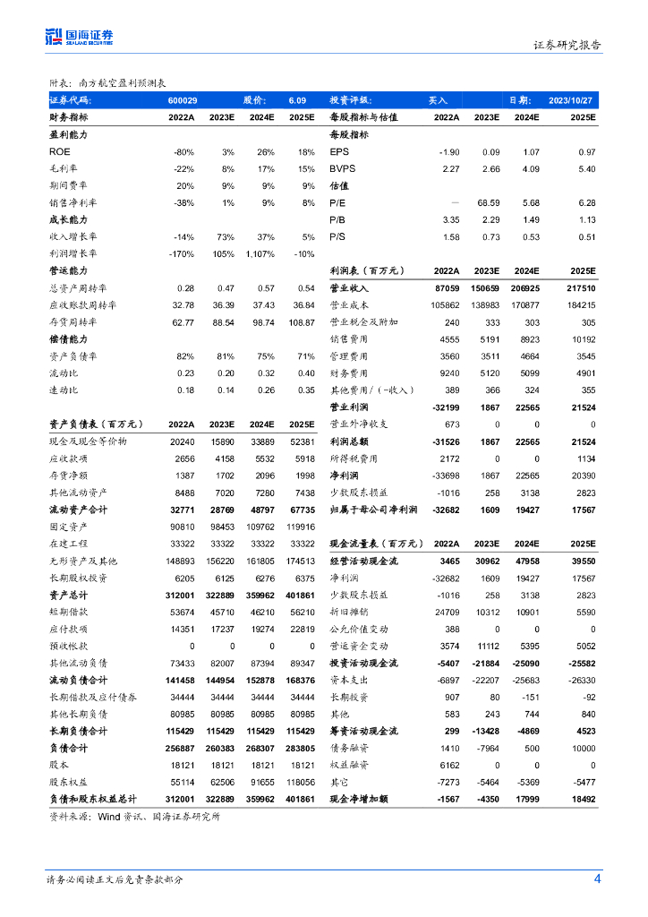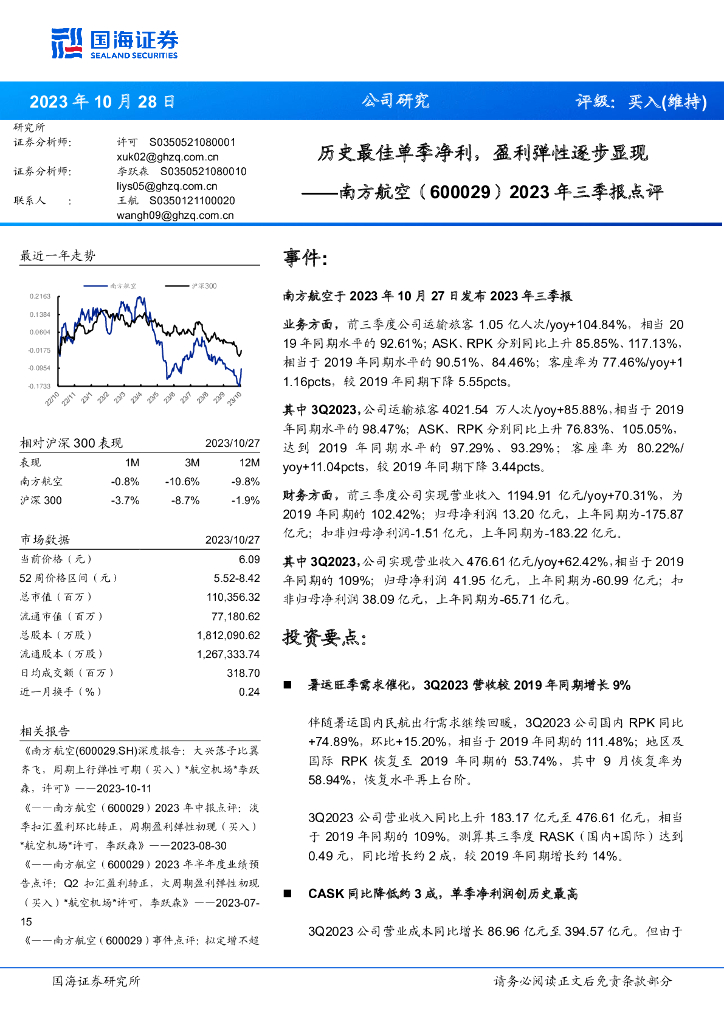 国海证券:南方航空(600029)-2023年三季报点评:历史最佳单季净利,盈利弹性逐步显现.pdf
