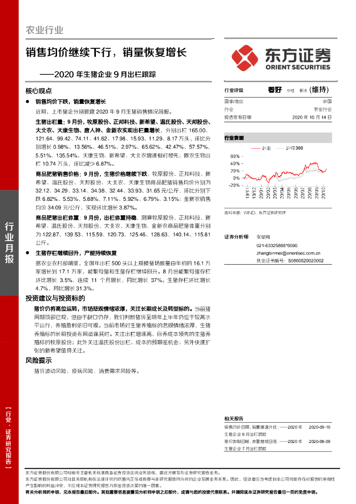 东方证券:农业行业2020年生猪企业9月出栏跟踪:销售均价继续下行,销量恢复增长.pdf