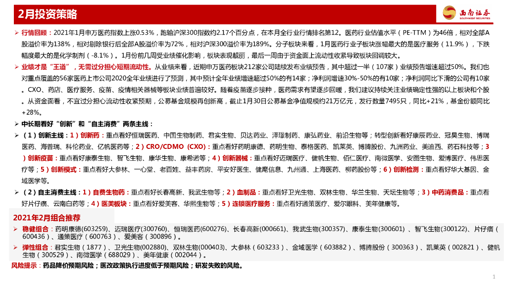 西南证券:医药行业2021年2月投资月报:业绩是“王道,“创新+自主消费”是核心主线.pdf