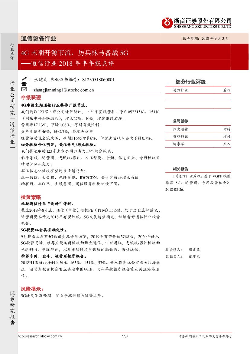 浙商证券:通信行业2018年半年报点评:4G末期开源节流,厉兵秣马备战5G.pdf