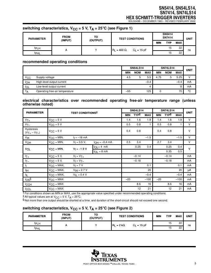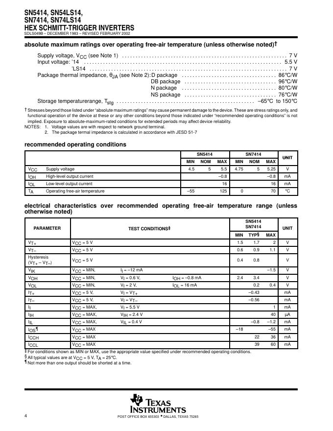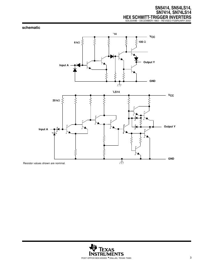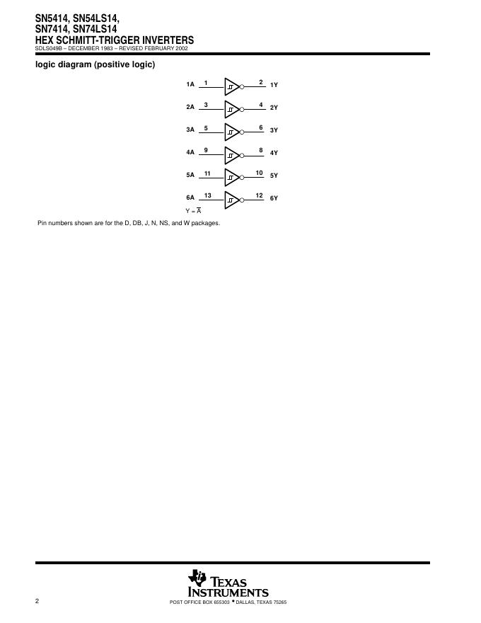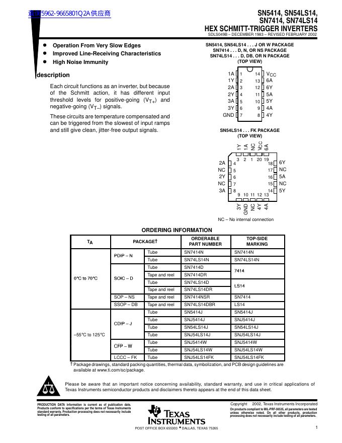 TEXAS INSTRUMENTS SN5414, SN54LS14, SN7414, SN74LS14 HEX SCHMITT-TRIGGER INVERTERS 数据手册.pdf