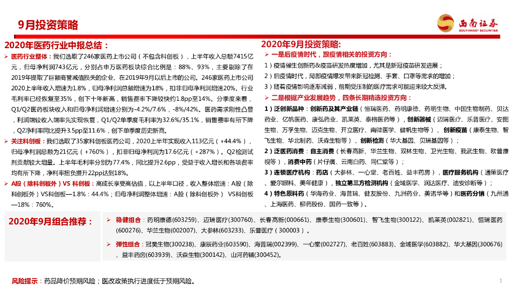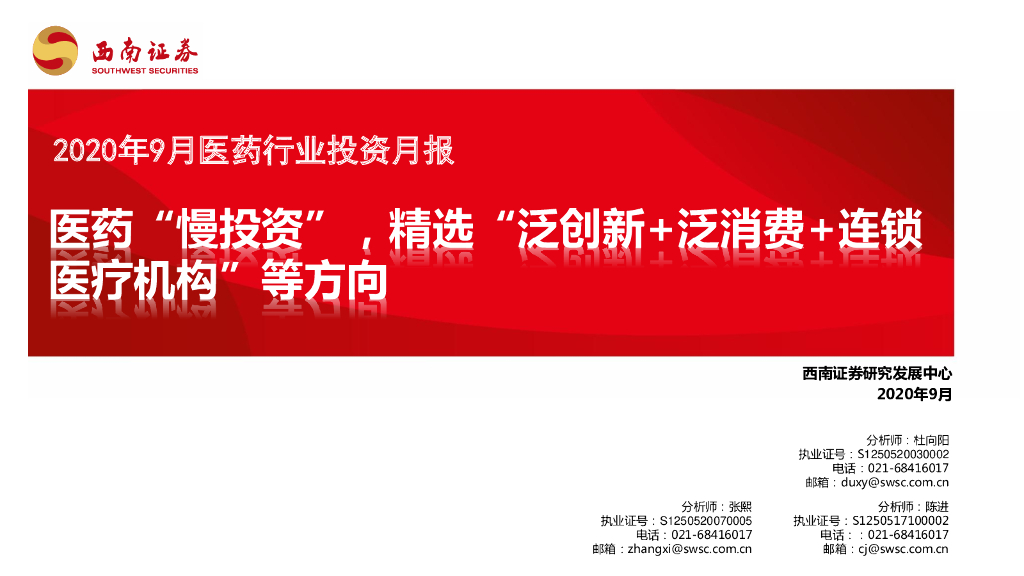 西南证券:2020年9月医药行业投资月报:医药“慢投资”,精选“泛创新+泛消费+连锁医疗机构”等方向.pdf