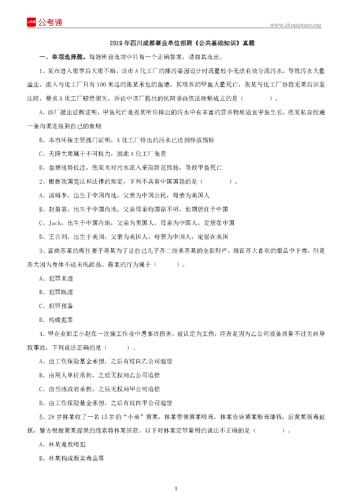 2019年四川成都事业单位招聘《公共基础知识》真题.pdf