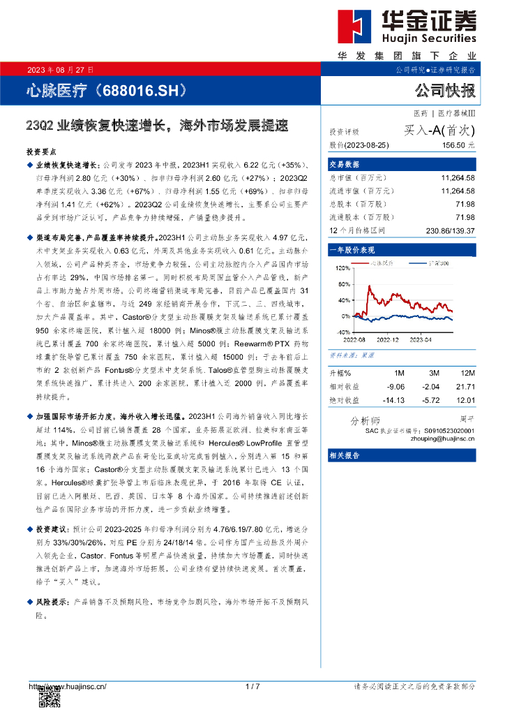 华金证券:心脉医疗(688016)-23Q2业绩恢复快速增长,海外市场发展提速.pdf