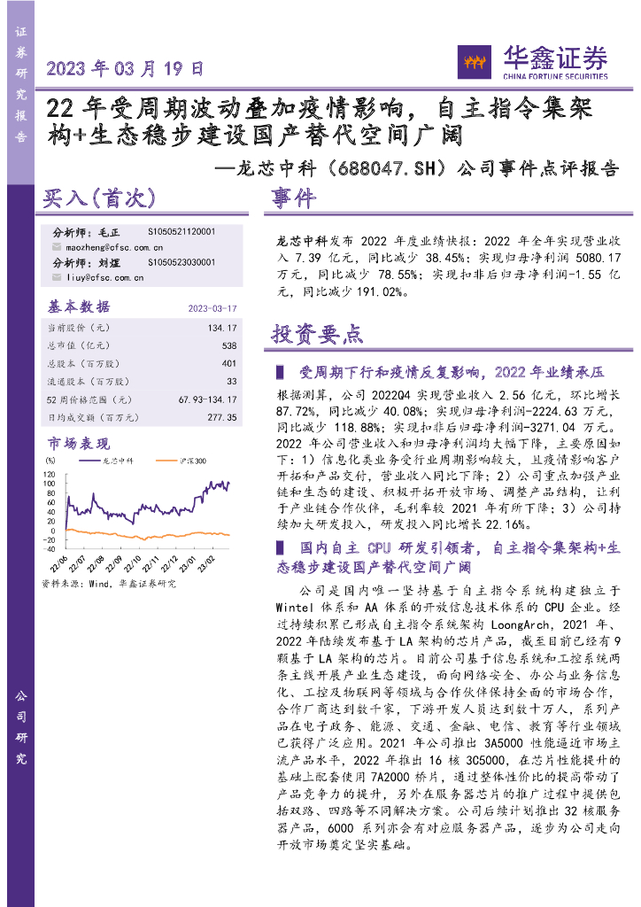 华鑫证券:龙芯中科(688047)-公司事件点评报告:22年受周期波动叠加疫情影响,自主指令集架构+生态稳步建设国产替代空间广阔.pdf