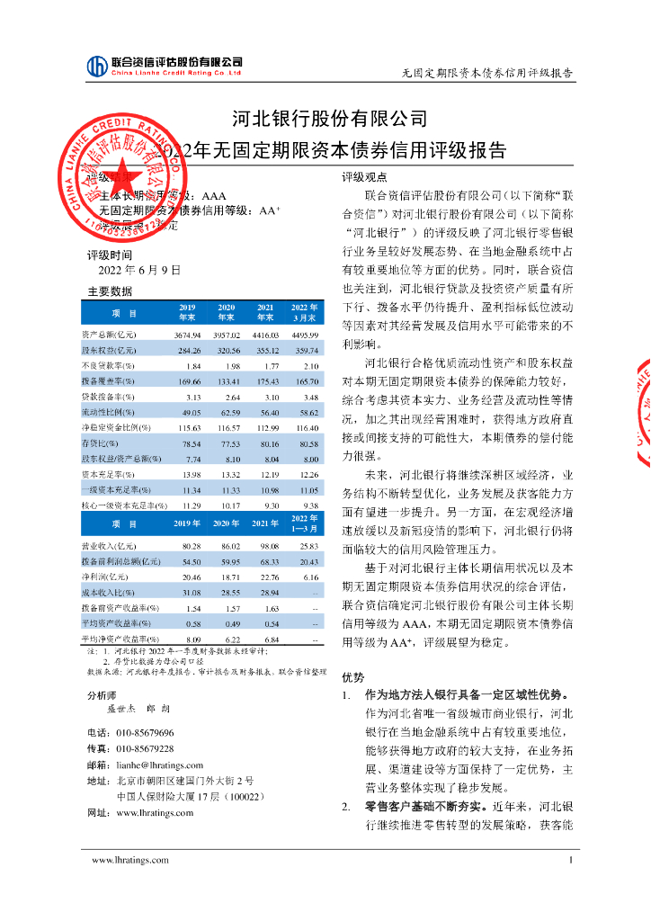 联合资信:河北银行股份有限公司2022年无固定期限资本债券信用评级报告及跟踪评级安排说明.pdf