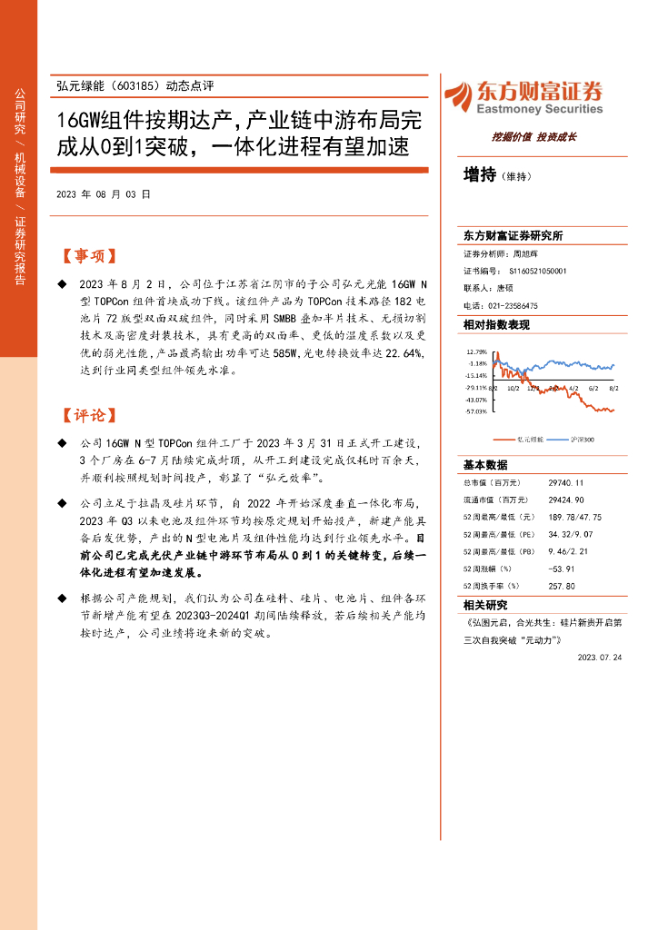 东方财富证券:弘元绿能(603185)-动态点评:16GW组件按期达产,产业链中游布局完成从0到1突破,一体化进程有望加速.pdf