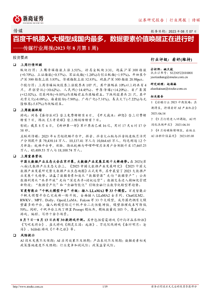 浙商证券:传媒行业周报(2023年8月第1周):百度千帆接入大模型成国内最多,数据要素价值唤醒正在进行时.pdf