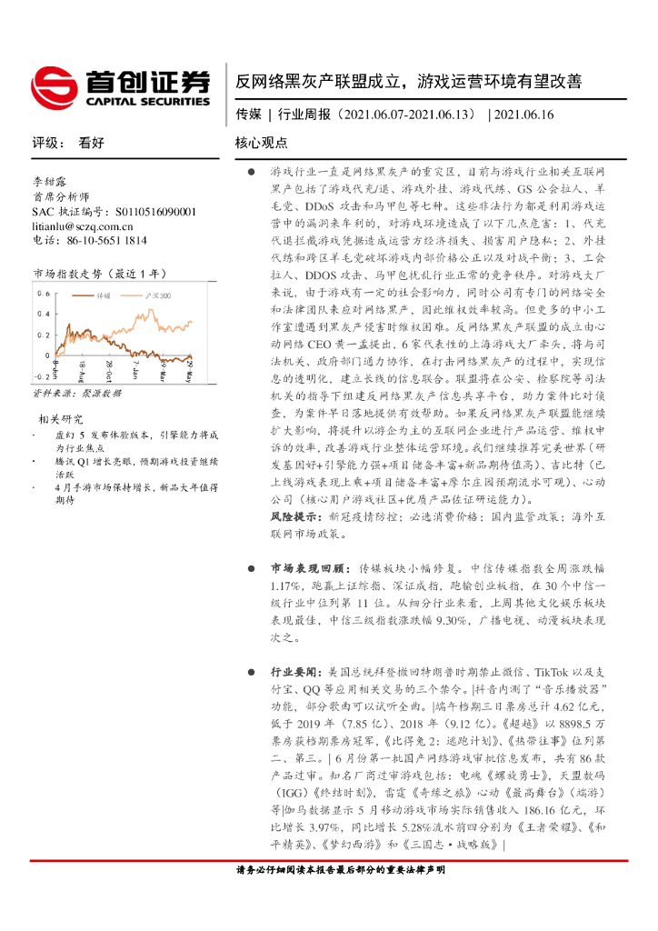 首创证券:传媒行业周报:反网络黑灰产联盟成立,游戏运营环境有望改善.pdf
