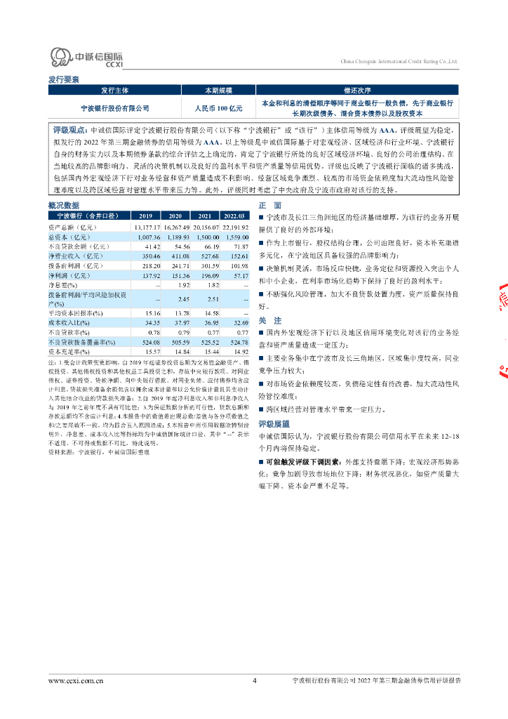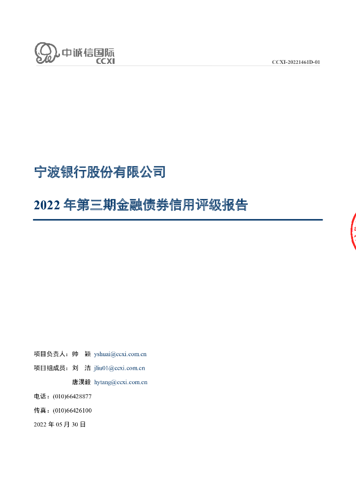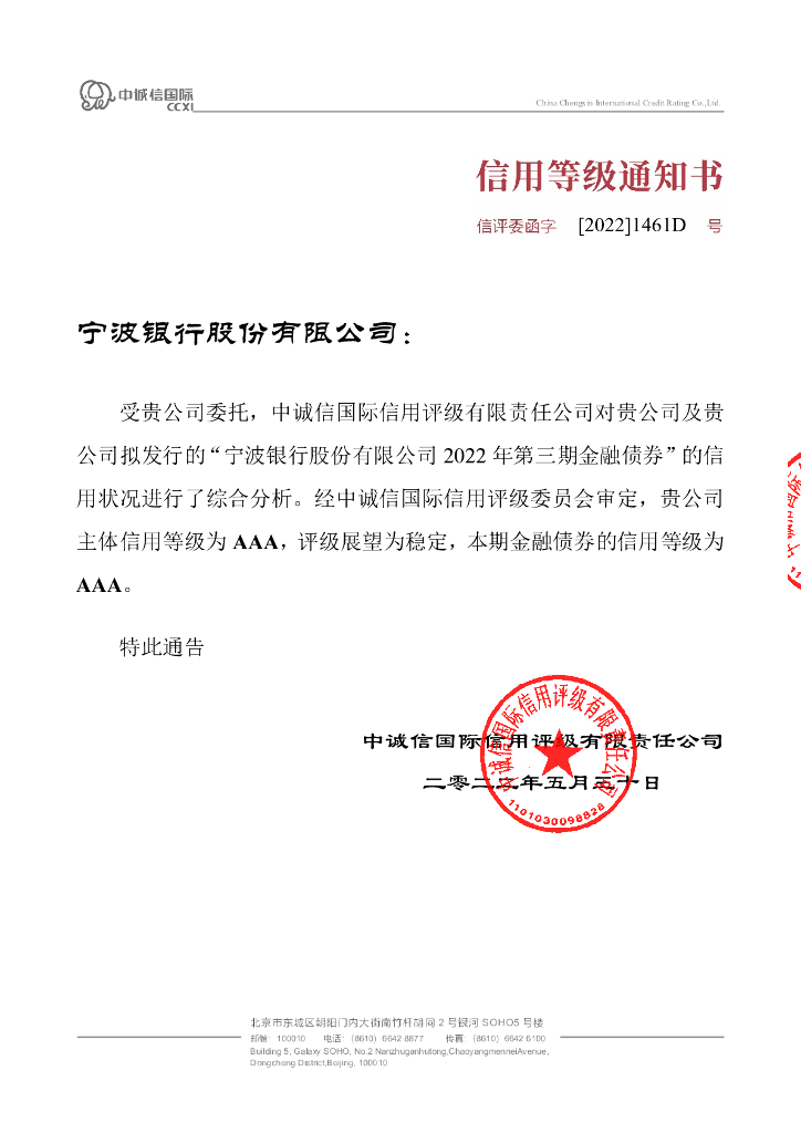 中诚信:宁波银行股份有限公司2022年第三期金融债券信用评级报告及跟踪评级安排.pdf