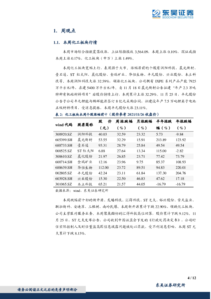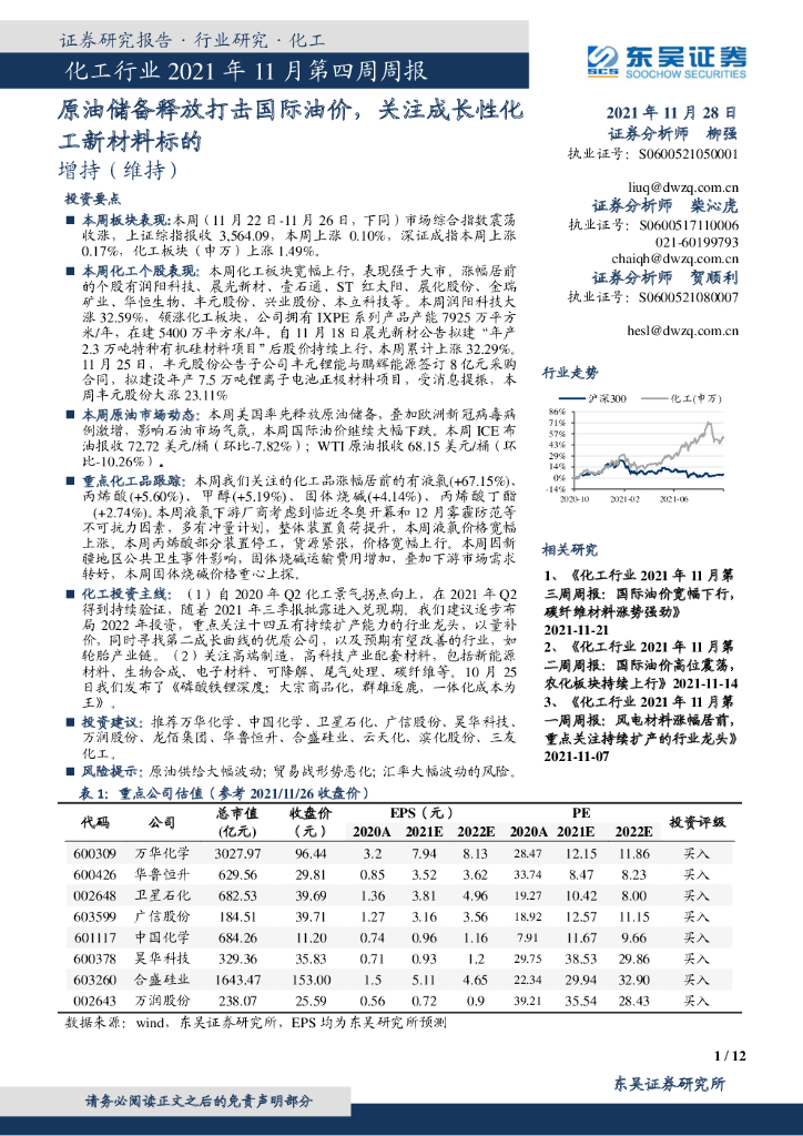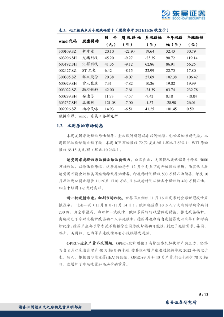 东吴证券:化工行业2021年11月第四周周报:原油储备释放打击国际油价,关注成长性化工新材料标的.pdf