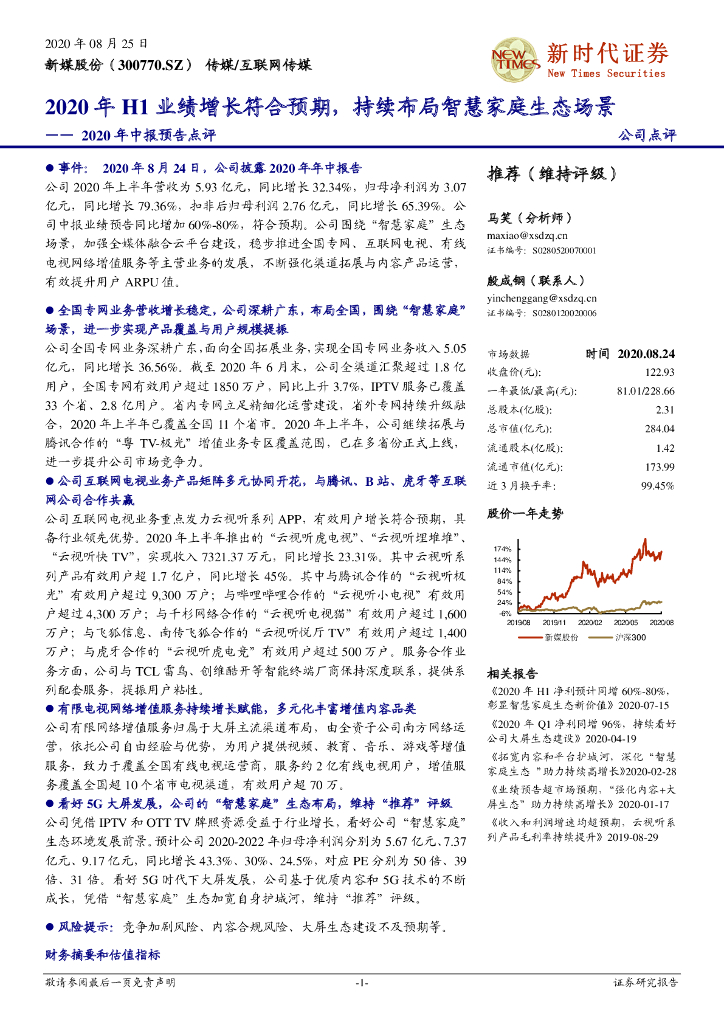 新时代证券:新媒股份(300770)-2020年中报预告点评:2020年H1业绩增长符合预期,持续布局智慧家庭生态场景.pdf