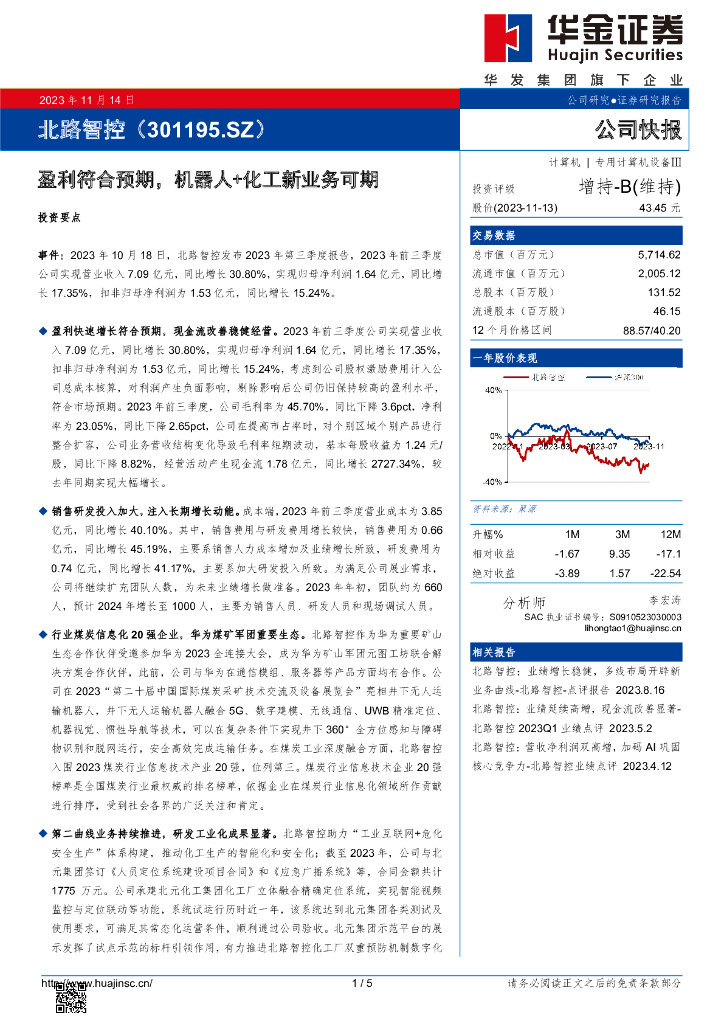 华金证券:北路智控(301195)-盈利符合预期,机器人+化工新业务可期.pdf