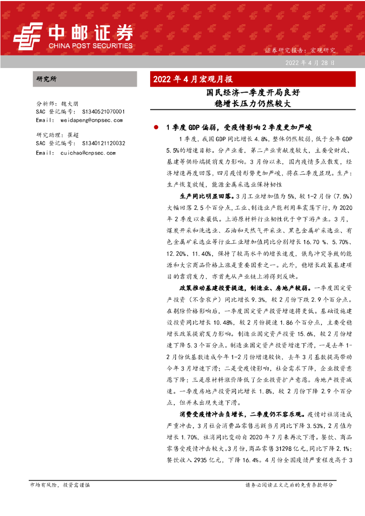 中邮证券:2022年4月宏观月报:国民经济一季度开局良好 稳增长压力仍然较大.pdf