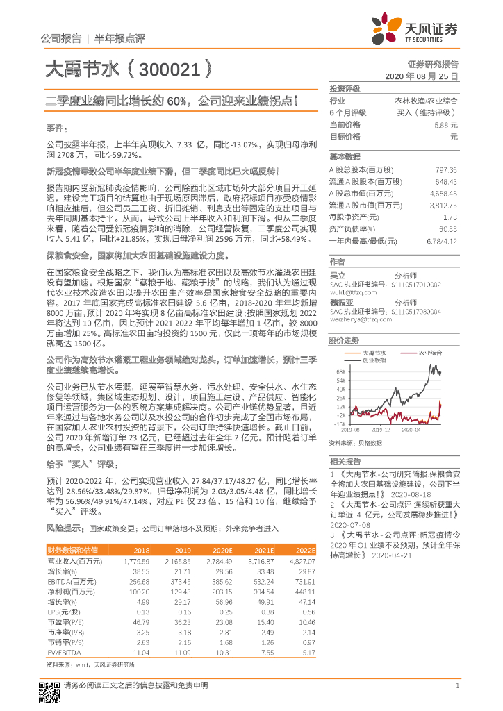天风证券:大禹节水(300021)-二季度业绩同比增长约60%,公司迎来业绩拐点!.pdf