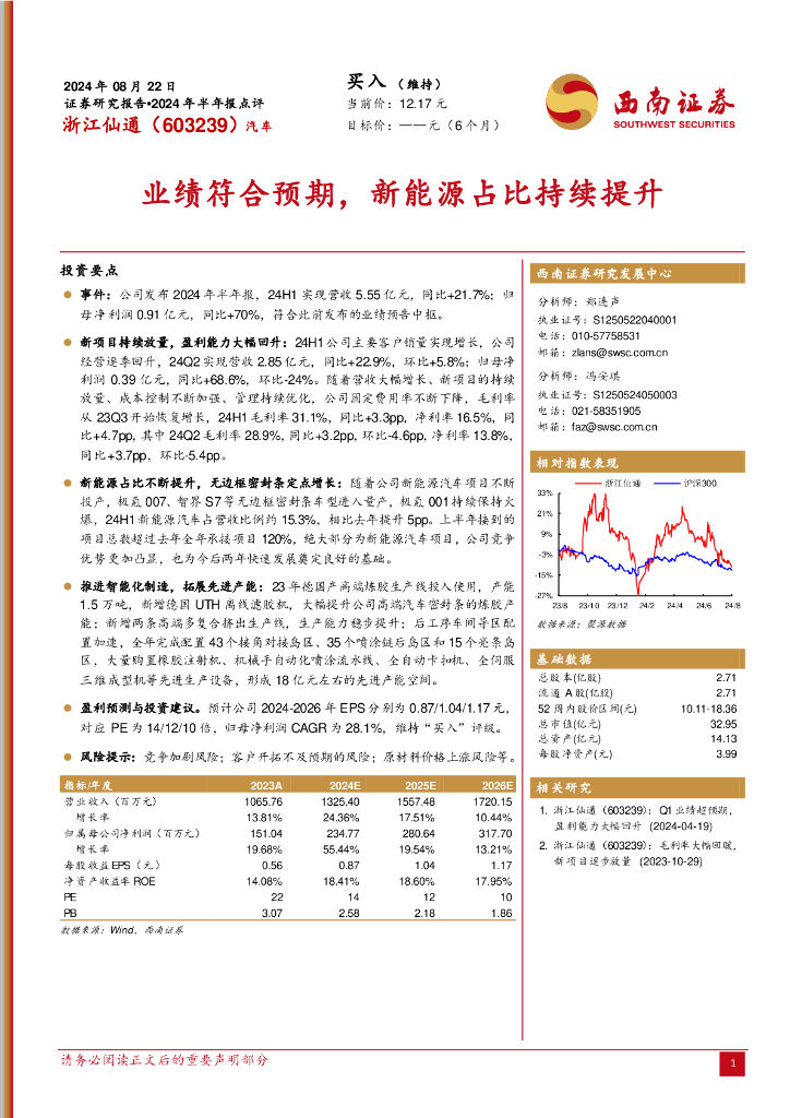 西南证券:浙江仙通(603239)-2024年半年报点评:业绩符合预期,新能源占比持续提升.pdf
