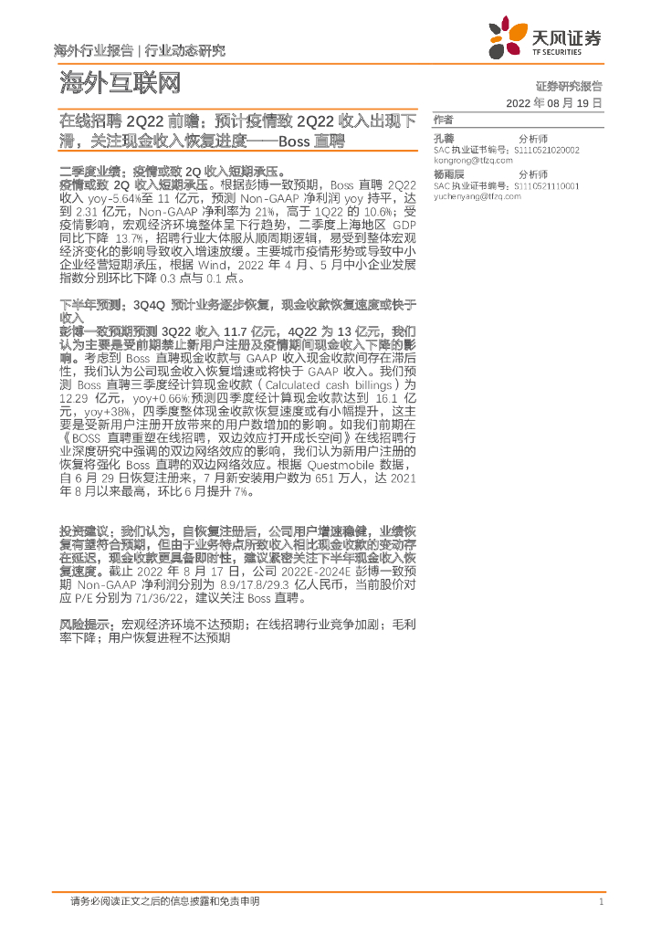 天风证券:海外互联网:在线招聘2Q22前瞻:预计疫情致2Q22收入出现下滑,关注现金收入恢复进度——Boss直聘.pdf