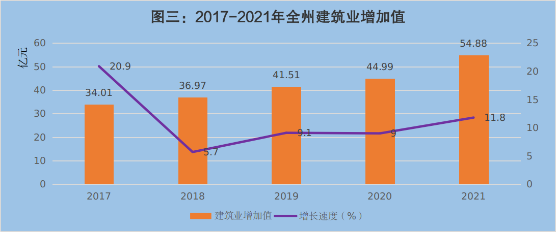 全年建筑业增加值54.88亿元,比上年增长11.8%。本地建筑业法人企业实现建筑业总产值43.44亿元,增长26.1%。从构成看,建安工程产值完成41.29亿元,增长34.7%,占总产值的95.1%;其他产值完成2.15亿元,下降43.0%,占总产值的4.9%。