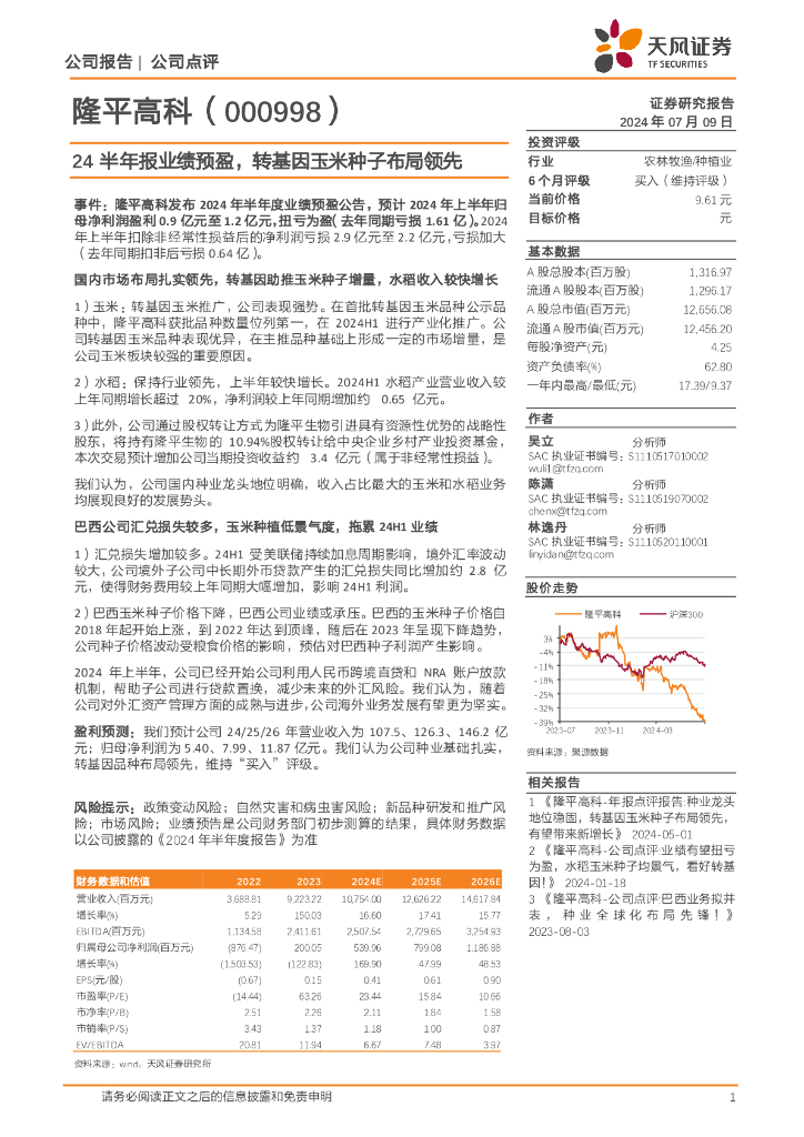 天风证券:隆平高科(000998)-24半年报业绩预盈,转基因玉米种子布局领先.pdf