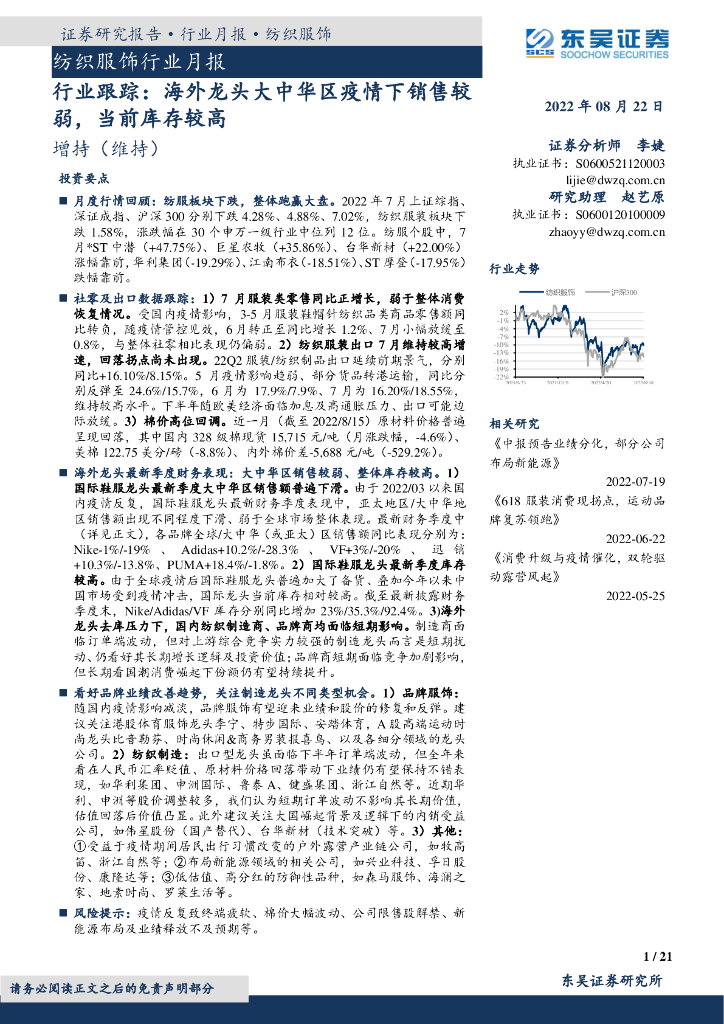 东吴证券:纺织服饰行业月报:行业跟踪:海外龙头大中华区疫情下销售较弱,当前库存较高.pdf