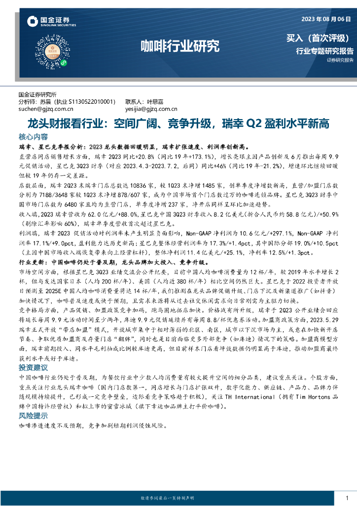 国金证券:咖啡行业研究:龙头财报看行业:空间广阔、竞争升级,瑞幸Q2盈利水平新高.pdf