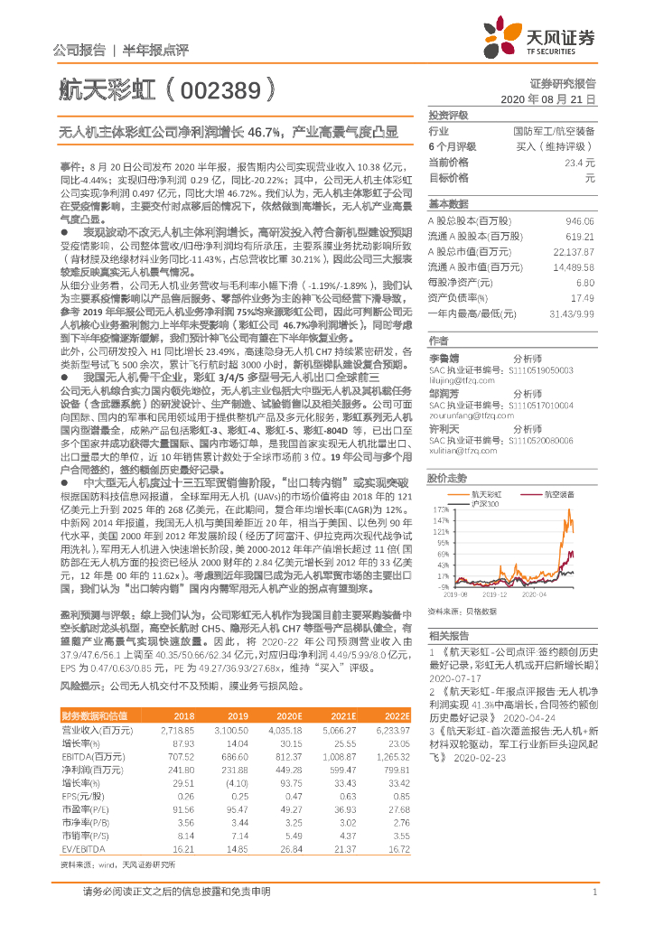 天风证券:航天彩虹(002389)-无人机主体彩虹公司净利润增长46.7%,产业高景气度凸显.pdf