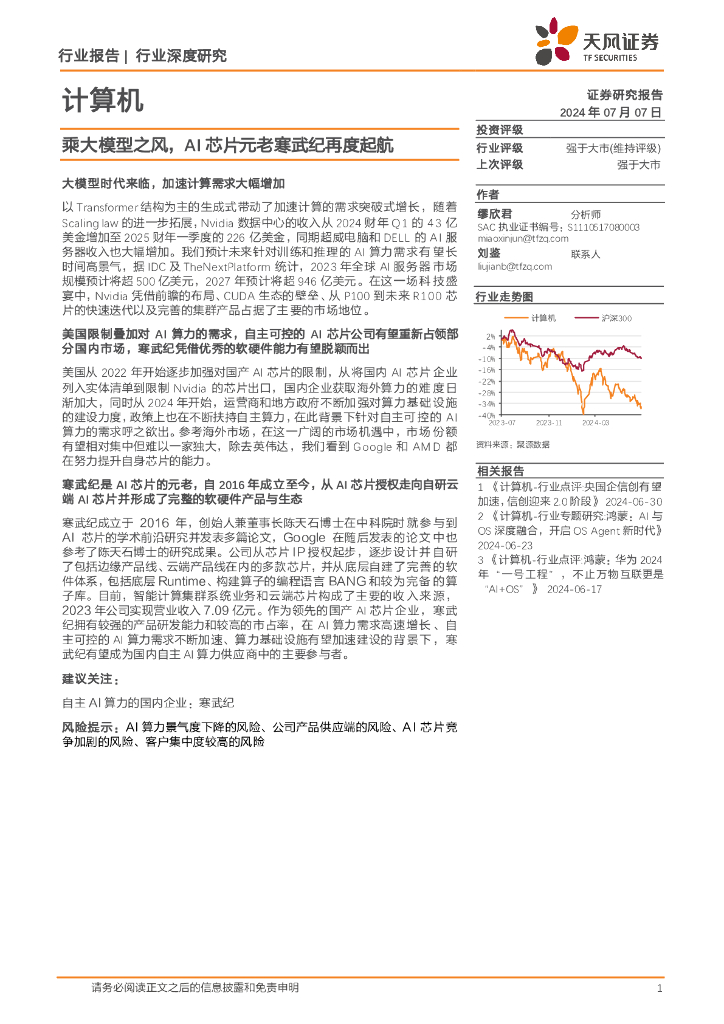 天风证券:计算机行业深度研究:乘大模型之风,AI芯片元老寒武纪再度起航.pdf