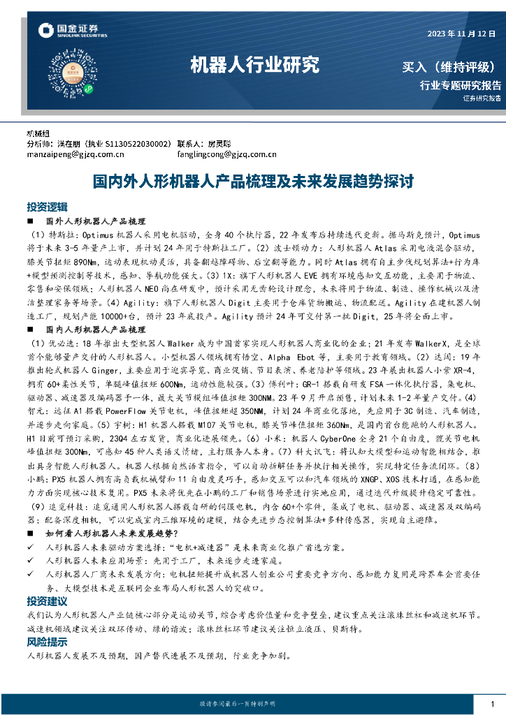 国金证券:机器人行业研究:国内外人形机器人产品梳理及未来发展趋势探讨.pdf