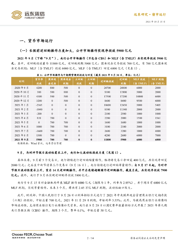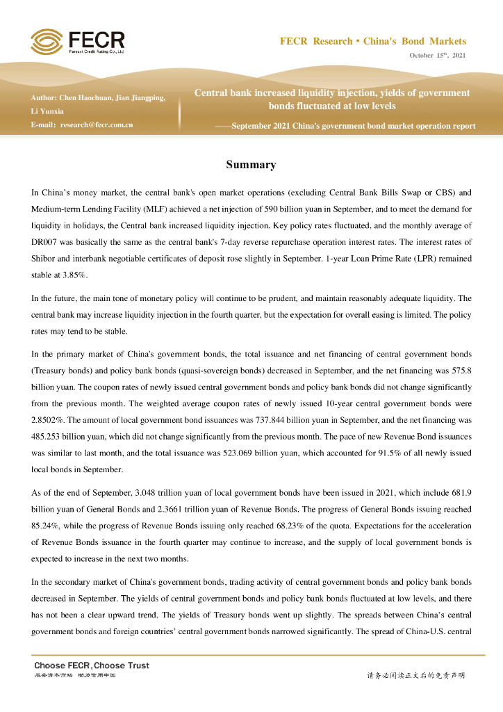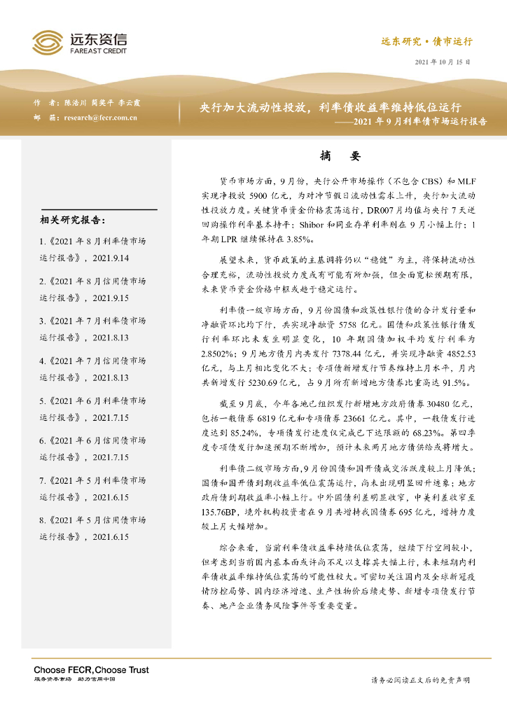 远东资信:2021年9月利率债市场运行报告:央行加大流动性投放,利率债收益率维持低位运行.pdf