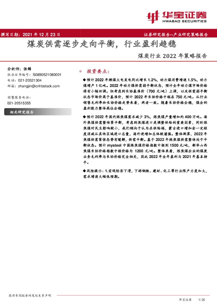 华宝证券:煤炭行业2022年策略报告:煤炭供需逐步走向平衡,行业盈利趋稳.pdf