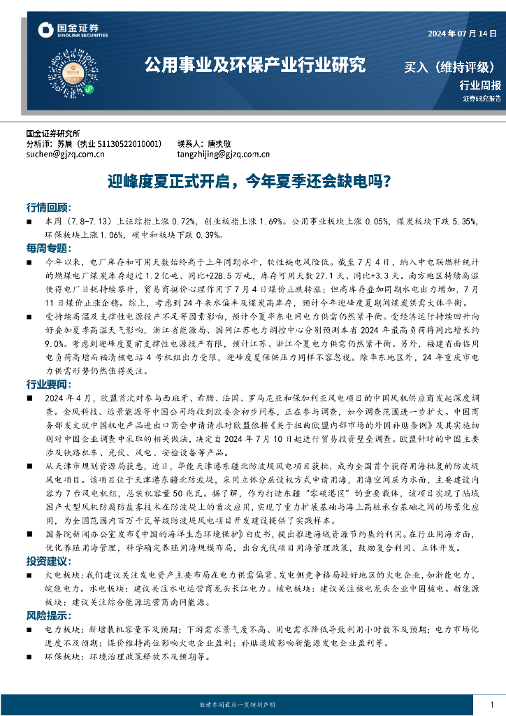 国金证券:公用事业及环保产业行业研究周报:迎峰度夏正式开启,今年夏季还会缺电吗?.pdf