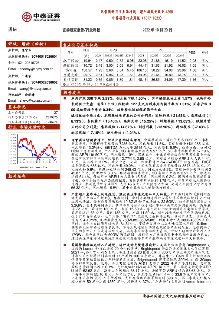 中泰证券:中泰通信行业周报:运营商新兴业务高增速,潮州海风电规划43GW.pdf