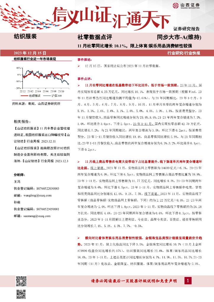 山西证券:纺织服装社零数据点评:11月社零同比增长10.1%,限上体育/娱乐用品消费韧性较强.pdf