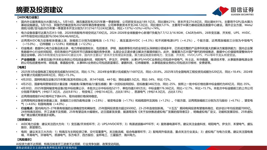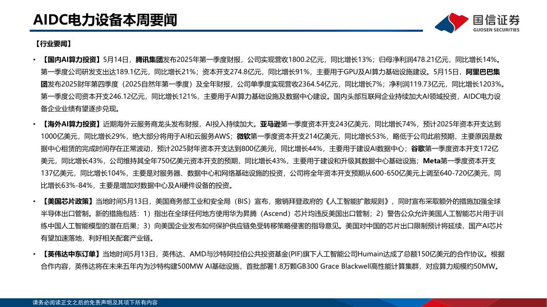 国信证券:AIDC电力设备/电网产业链周评(5月第3周):国内外云厂一季度资本开支大增,国内电网投资景气度上行.pdf