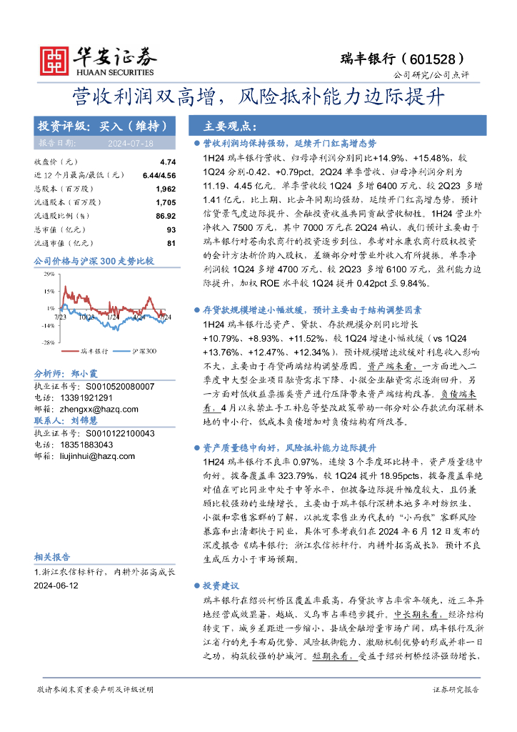 华安证券:瑞丰银行(601528)-营收利润双高增,风险抵补能力边际提升.pdf
