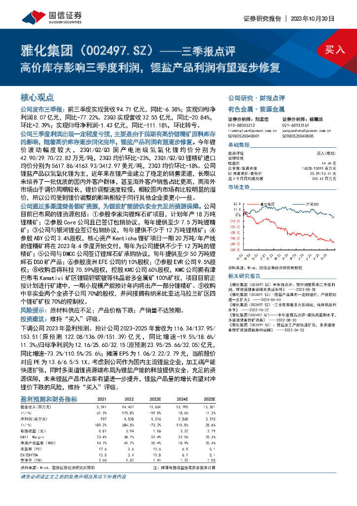 国信证券:雅化集团(002497)-三季报点评:高价库存影响三季度利润,锂盐产品利润有望逐步修复.pdf