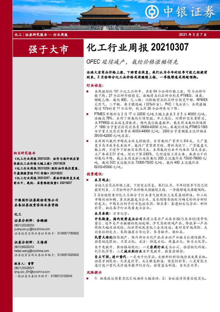 中银证券:化工行业周报:OPEC延续减产,氨纶价格涨幅领先.pdf