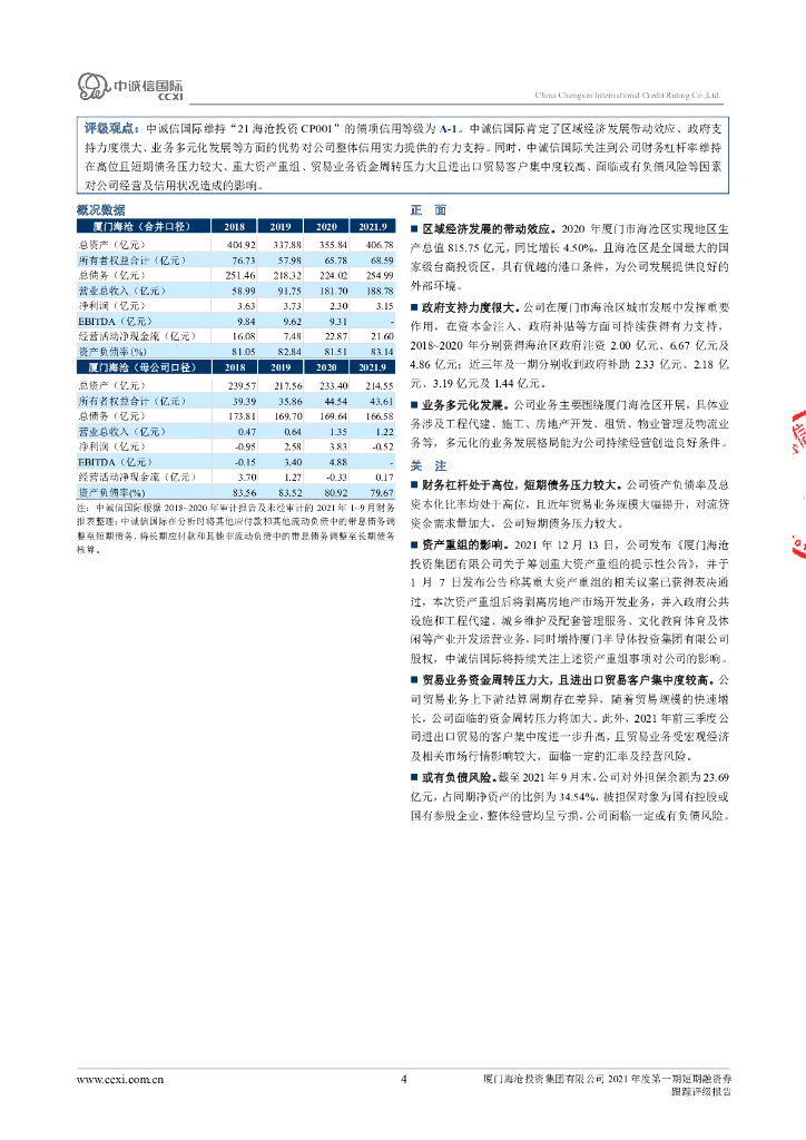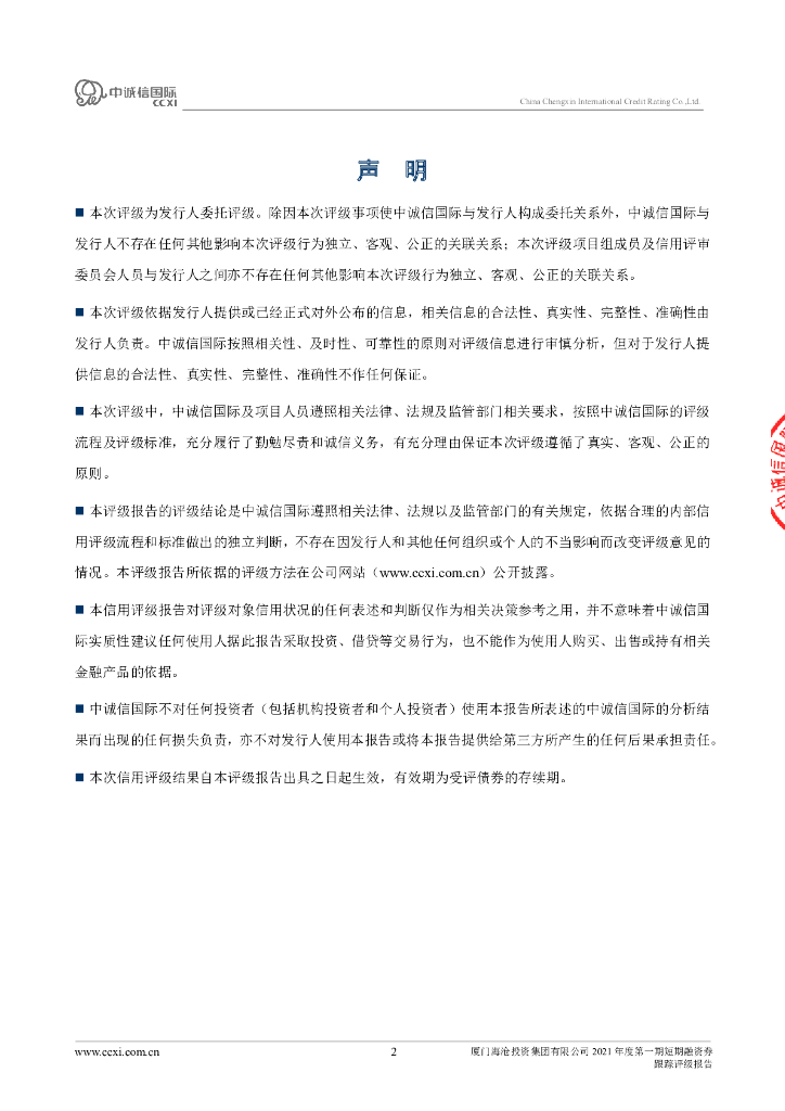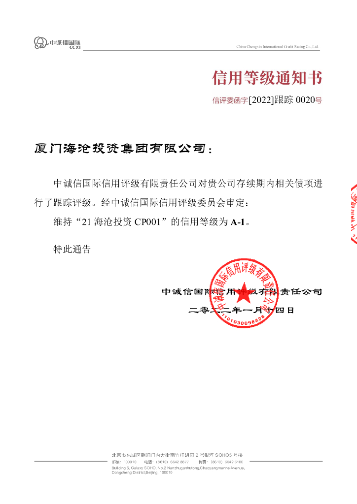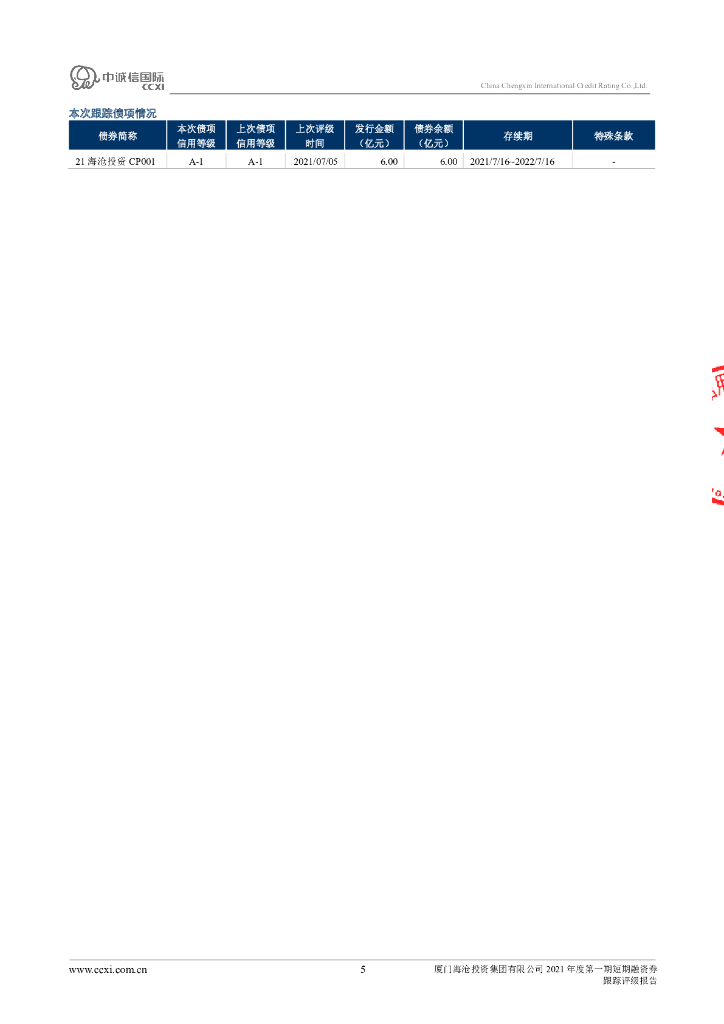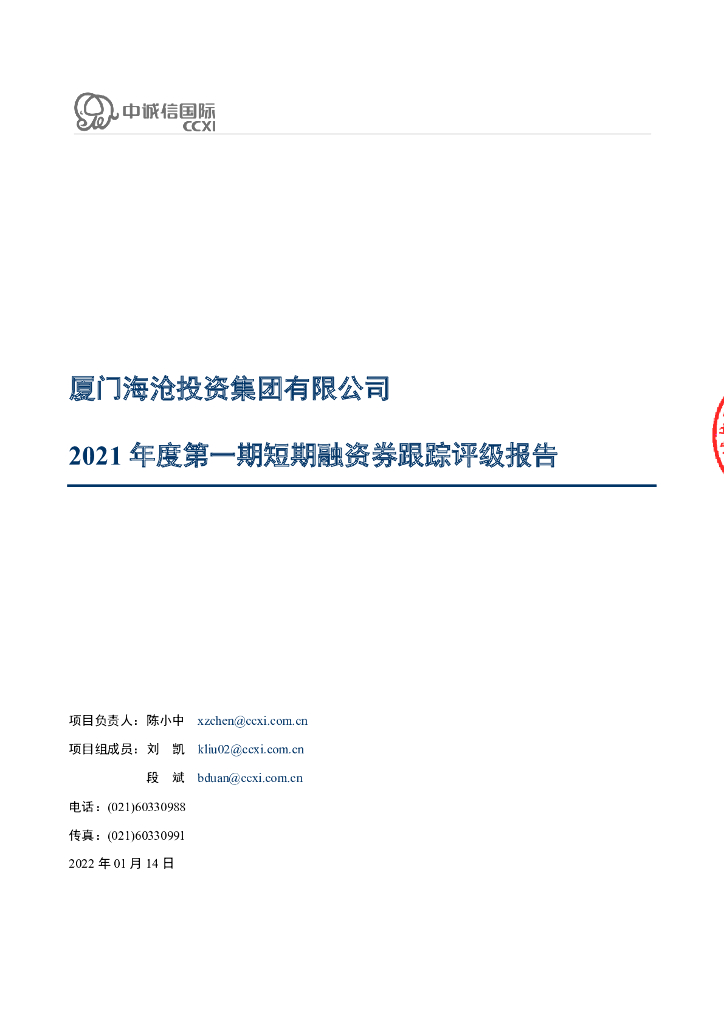中诚信:厦门海沧投资集团有限公司2021年度第一期短期融资券跟踪评级报告.pdf