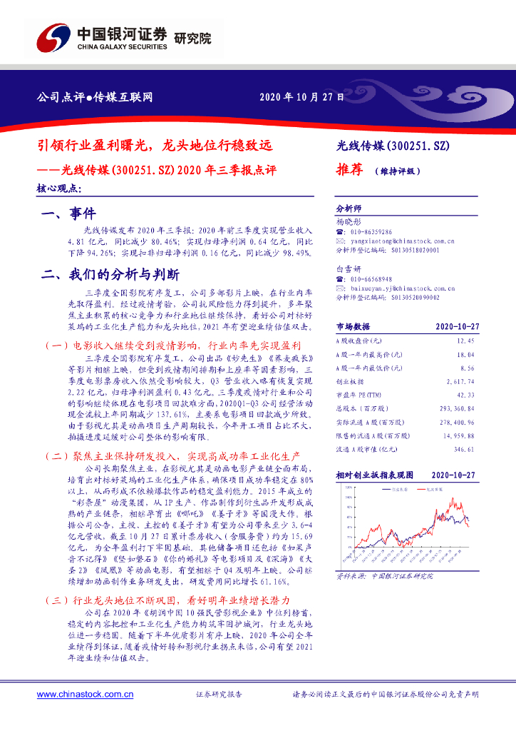中国银河:光线传媒(300251)-2020年三季报点评:引领行业盈利曙光,龙头地位行稳致远.pdf