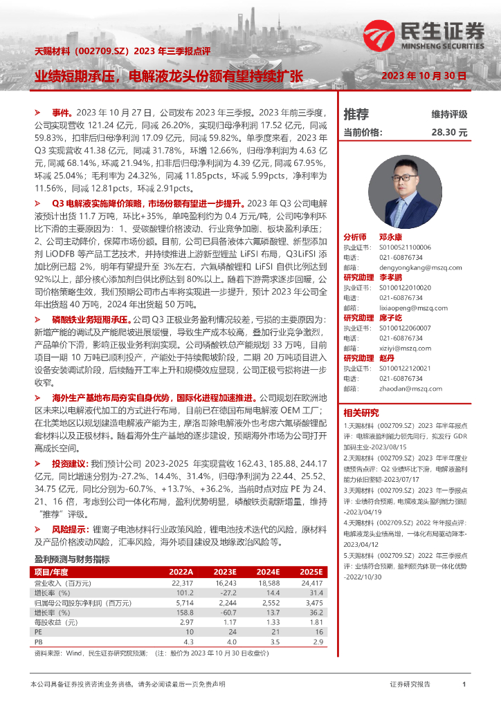 民生证券:天赐材料(002709)-2023年三季报点评:业绩短期承压,电解液龙头份额有望持续扩张.pdf