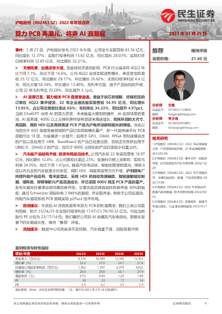 民生证券:沪电股份(002463)-2022年年报点评:算力PCB弄潮儿,将乘AI浪潮起.pdf