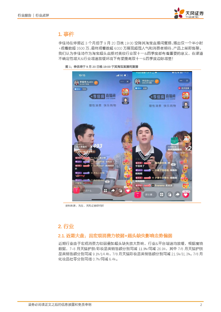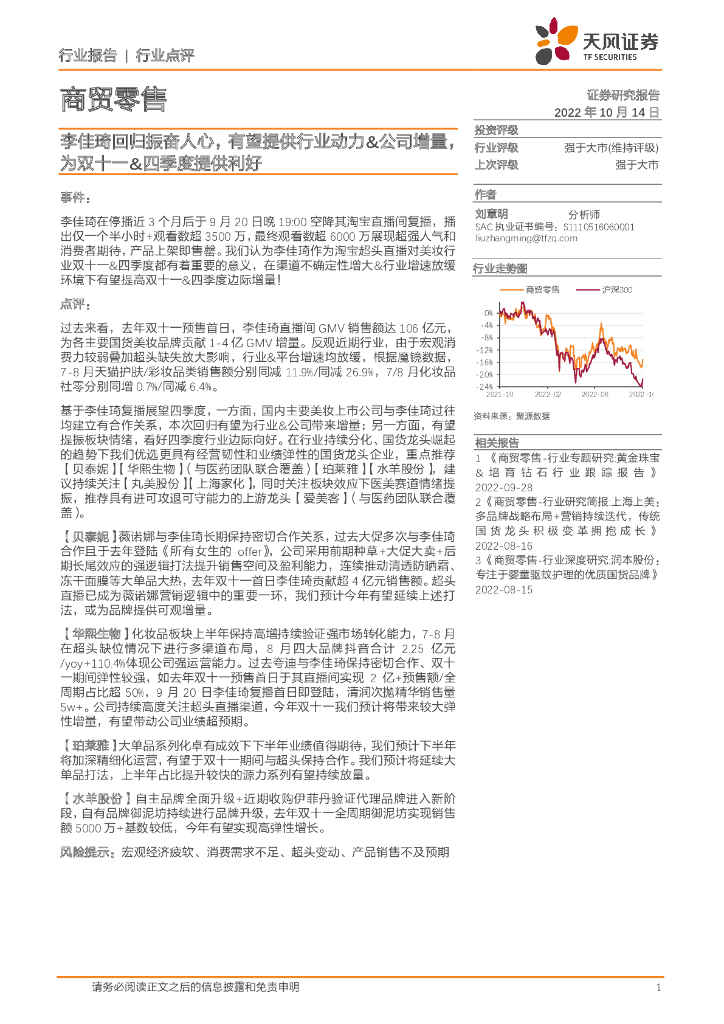 天风证券:商贸零售行业点评:李佳琦回归振奋人心,有望提供行业动力&公司增量,为双十一&四季度提供利好.pdf
