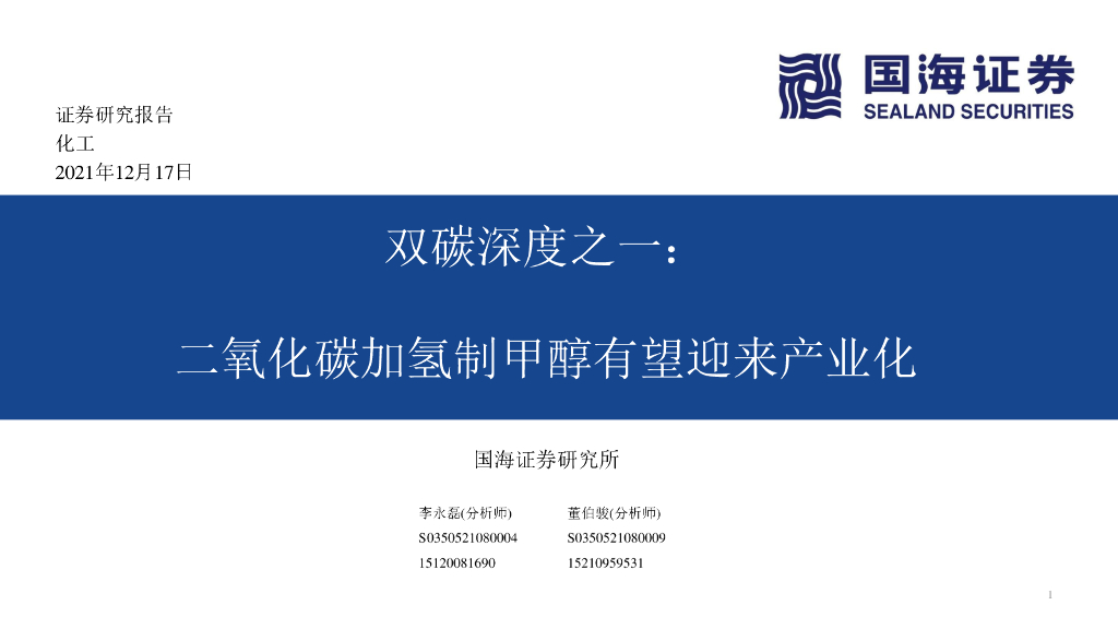 国海证券:化工:双碳深度之一-二氧化碳加氢制甲醇有望迎来产业化.pdf