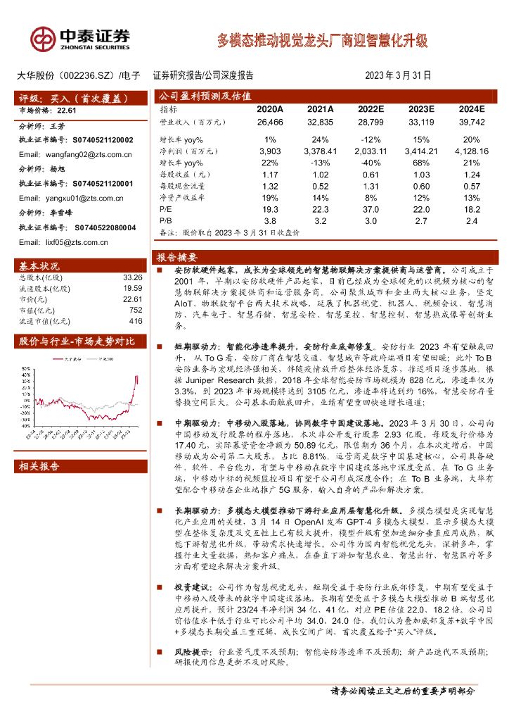 中泰证券:大华股份(002236)-多模态推动视觉龙头厂商迎智慧化升级.pdf