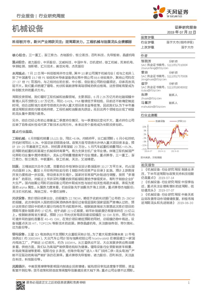 天风证券:机械设备行业研究周报:科创板开市,新兴产业将获关注;逆周期发力,工程机械与油服龙头业绩靓丽.pdf