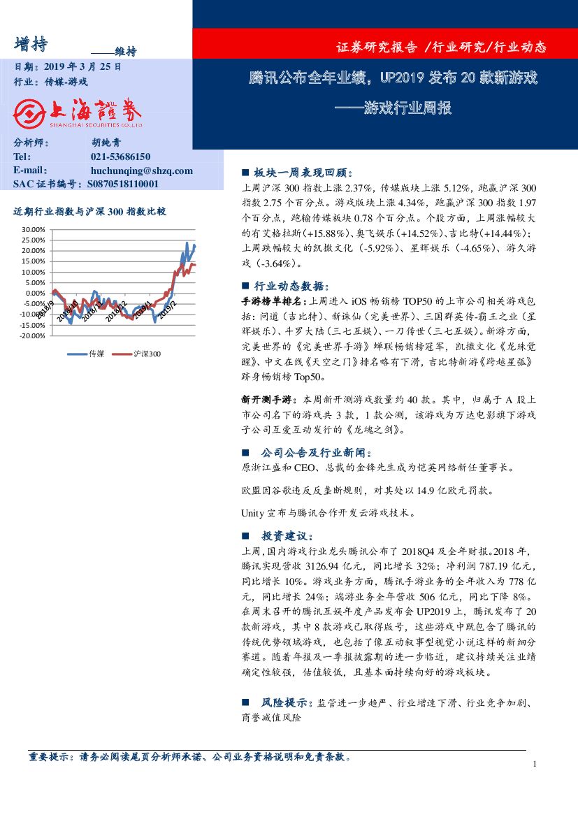 上海证券:游戏行业周报:腾讯公布全年业绩,UP2019发布20款新游戏.pdf