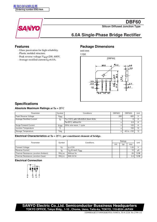 SANYO DBF60 Silicon Diffused Junction Type 6.0A Single-Phase Bridge Rectifier 数据手册.pdf