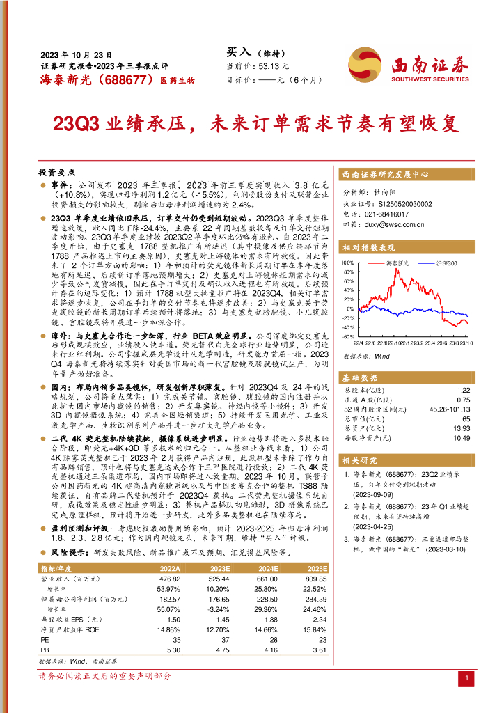 西南证券:海泰新光(688677)-2023年三季报点评:23Q3业绩承压,未来订单需求节奏有望恢复.pdf